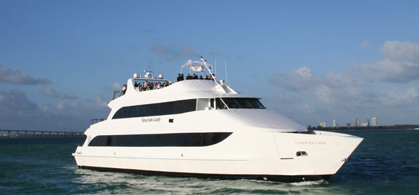The Venetian Lady is a brand new 130-foot luxury yacht accommodating up to 140 passengers. The newest addition to an already extraordinary fleet, the Venetian Lady is 130 feet long and comes equipped with luxurious 8-foot ceilings, three decks, two dance floors, state-of-the-art audio/visual equipment and our signature cuisine. A bridal room is available for that all-important day! Join us with groups of up to 140 guests aboard Miami's most beautiful new yacht.